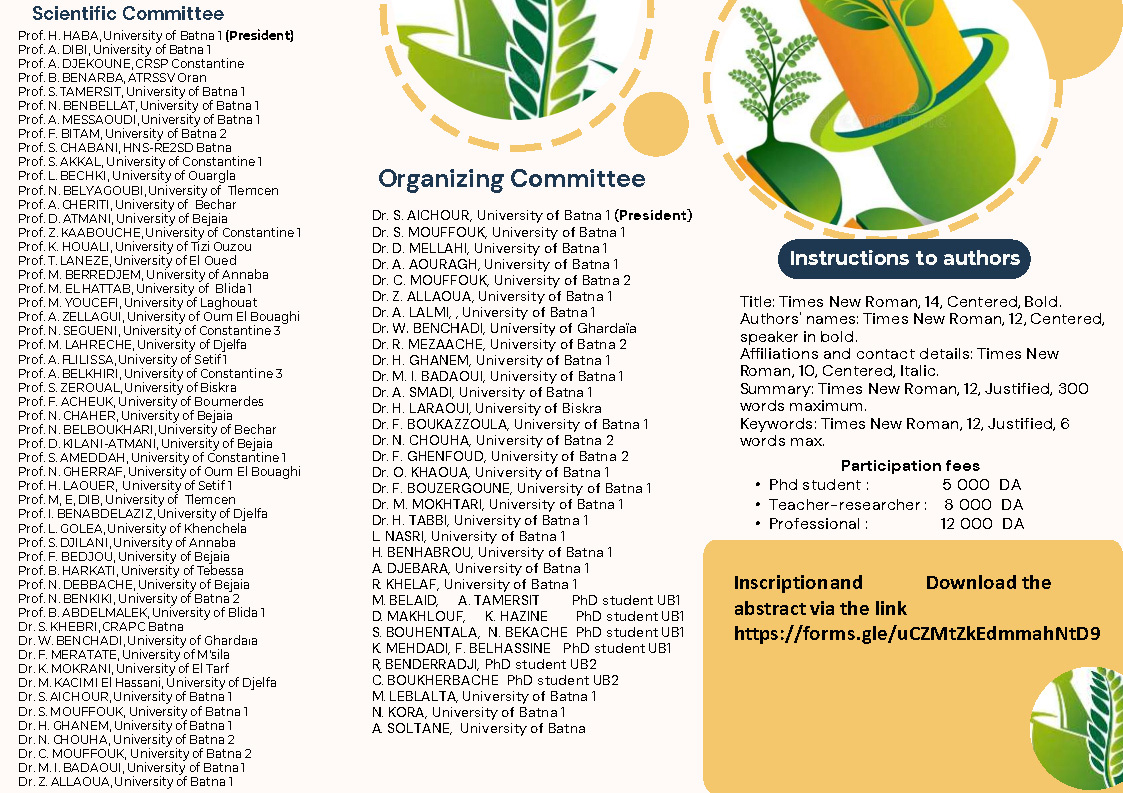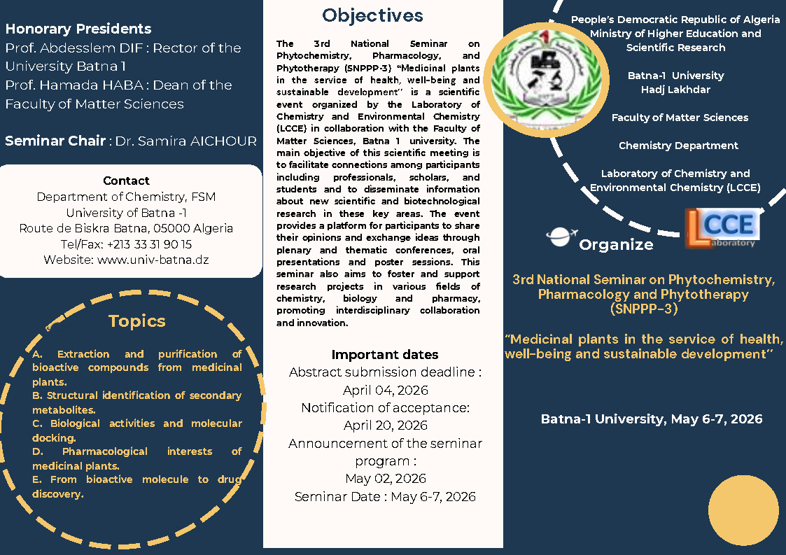 The 3rd National Seminar on Phytochemistry, Pharmacology, and Phytotherapy (SNPPP-3) “Medicinal plants in the service of health, well-being and sustainable development’’ is a scientific event organized by the Laboratory of Chemistry and Environmental Chemistry (LCCE) in collaboration with the Faculty of Matter Sciences, Batna 1 university.